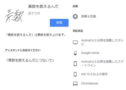 Google アシスタントアプリ『素数を数えるんだ』をリリースしました。 Google Home に向かって「OK Google、素数を数えるんだ」と言うと、2から101までの素数を数え上げます。 Google アシスタントでは「素数を数えるんだ」と入力すると画像検索になってしま…
