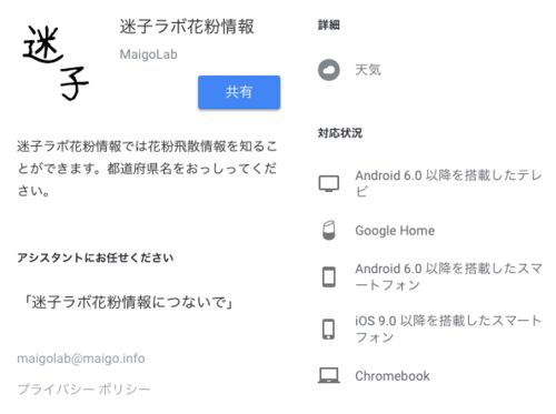 Google アシスタントアプリ『迷子ラボ花粉情報』をリリースしました。 「迷子ラボ花粉情報につないで」「花粉飛散」などのキーワードで起動できます。 起動した後は、都道府県名を言うことで花粉飛散情報を聞くことができます。 花粉情報のデータは 花粉対策…