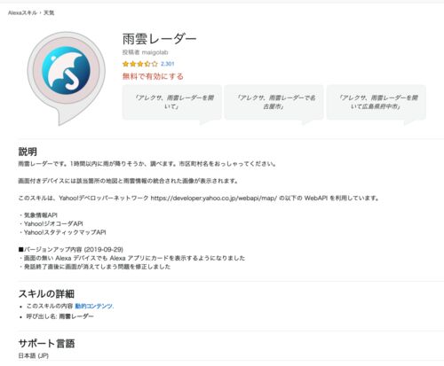 Alexa スキル『雨雲レーダー』をアップデートしました。 ■バージョンアップ内容 (2019-09-29) ・画面の無い Alexa デバイスでも Alexa アプリにカードを表示するようになりました ・発話終了直後に画面が消えてしまう問題を修正しました Alexa スキル『雨雲…